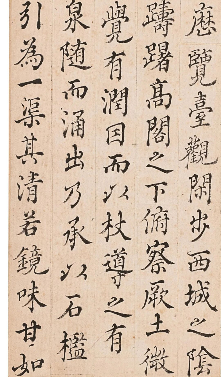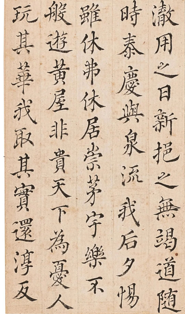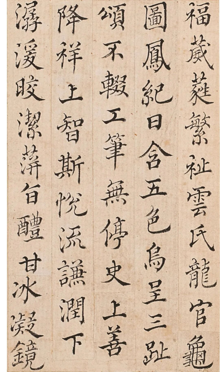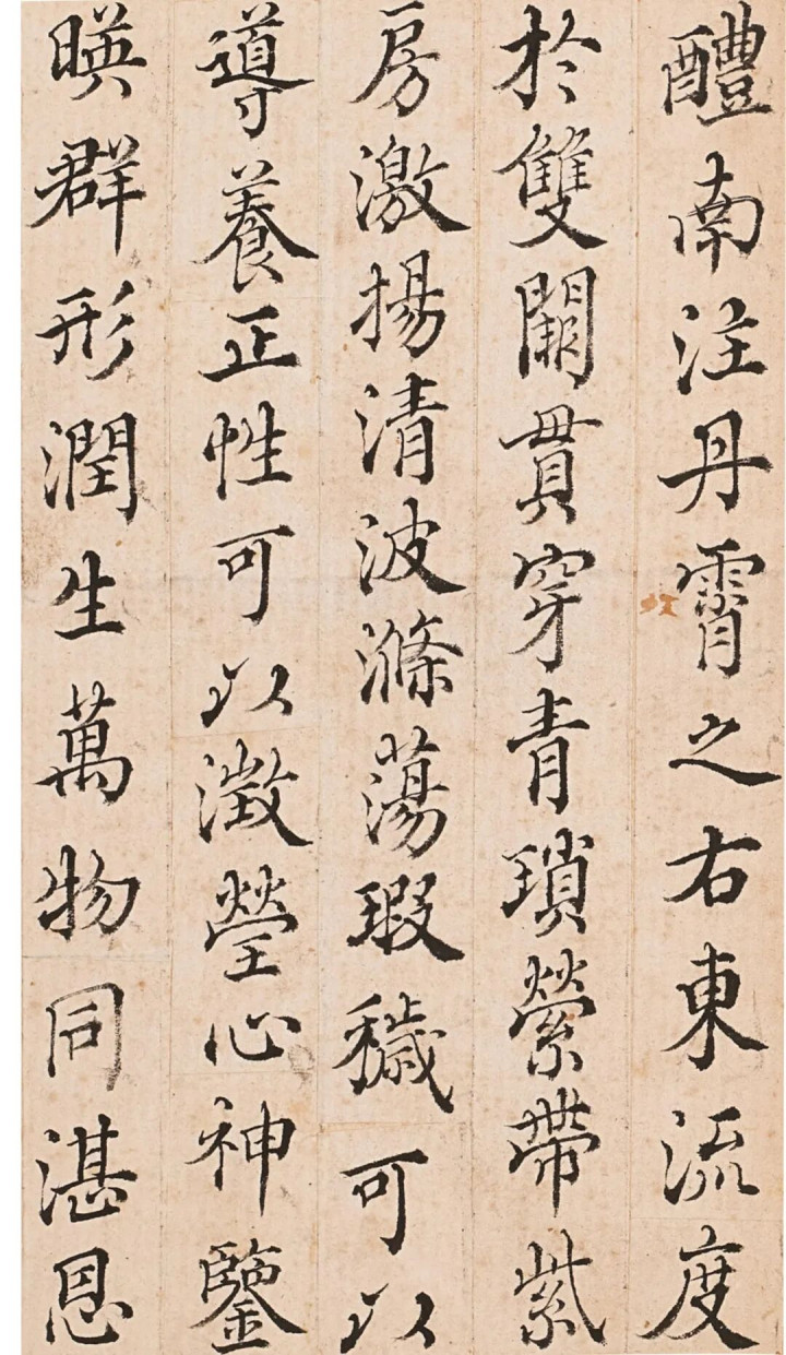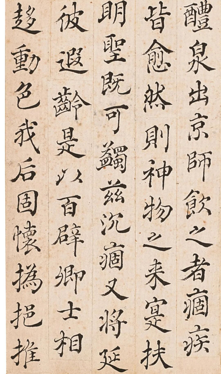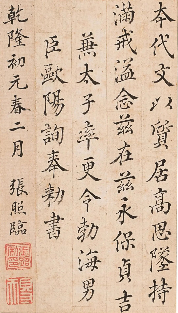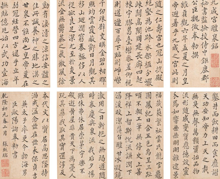 本册为乾隆朝书法家张照,缩临唐代楷书大家欧阳询晚年钜作《九成宫醴泉铭》。此册原为康熙朝废太子、理密亲王允礽之孙、辅国公永璥所属「钦训堂」旧藏,后辗转流传至光绪年间收藏家、翰林院编修邵松年之手,其成册、装裱形式、临摹风格与所钤印鉴均见于其所着《澄兰室古缘萃录》卷十二—〈张天瓶缩临醴泉铭册〉中。此作书于乾隆元年二月,是年张照四十岁,任武英殿修书处行走。张照少年得志,又曾居庙堂高位,历经宦海浮沉,此册即出于仕途中挫,沉潜养气期间,当时心境更趋于平淡闲静。由书法来看,行笔严谨稳重,对于九成宫之临摹也有精确的掌握,堪称书法迈入成熟期的写照。