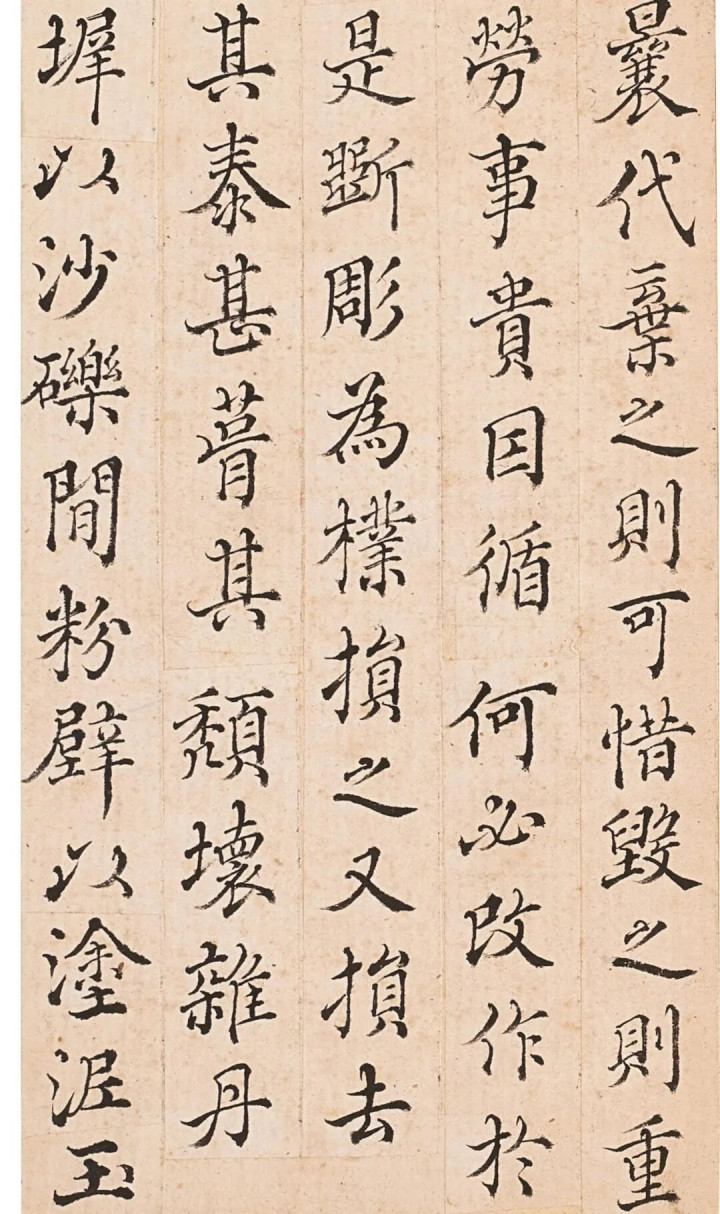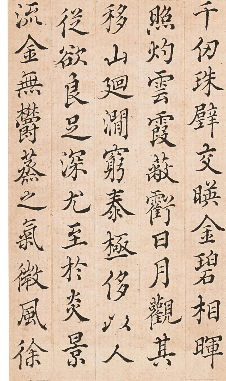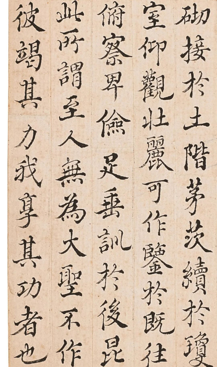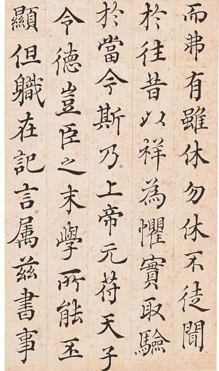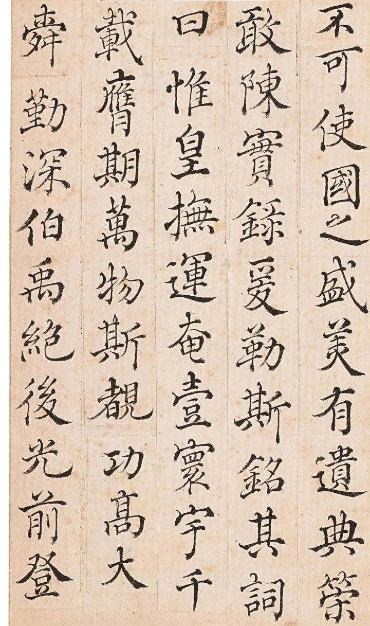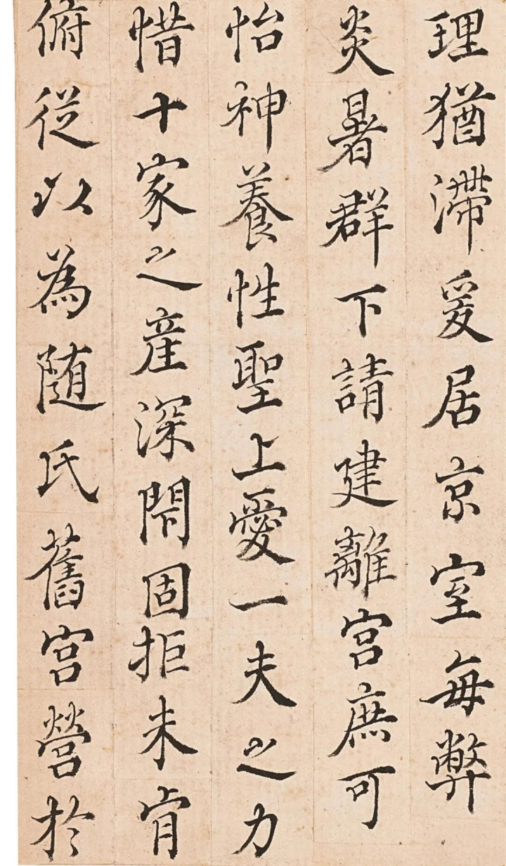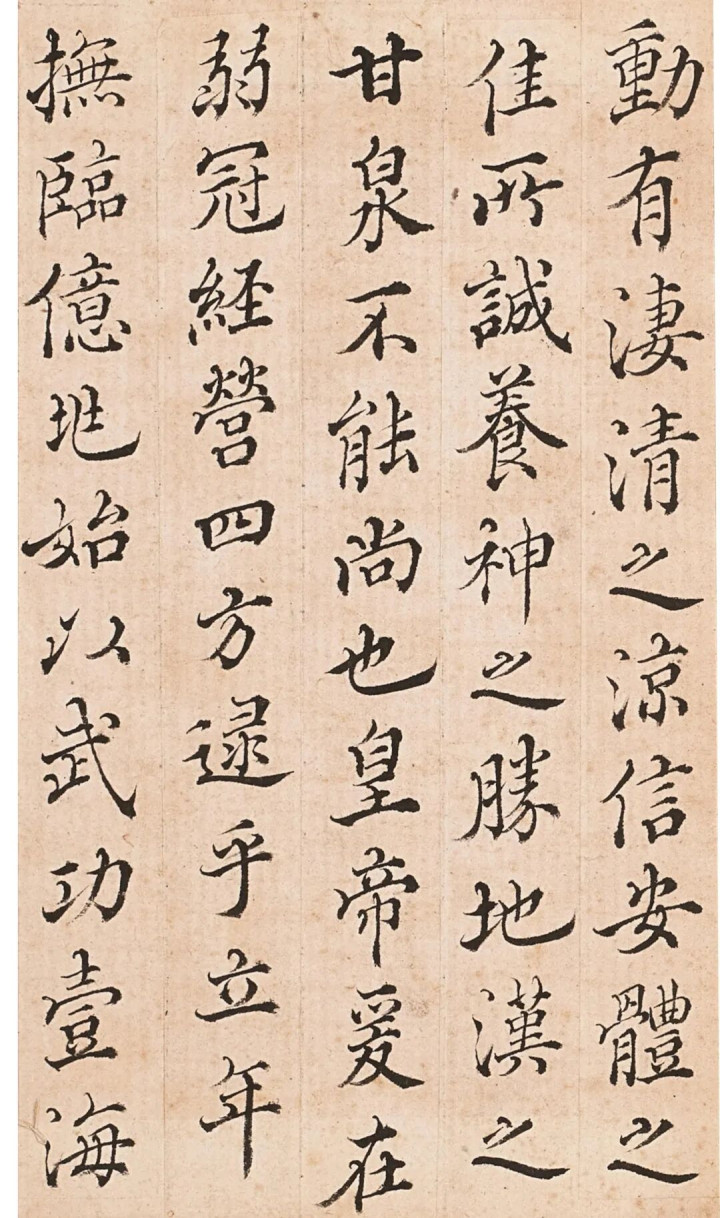 本册为乾隆朝书法家张照,缩临唐代楷书大家欧阳询晚年钜作《九成宫醴泉铭》。此册原为康熙朝废太子、理密亲王允礽之孙、辅国公永璥所属「钦训堂」旧藏,后辗转流传至光绪年间收藏家、翰林院编修邵松年之手,其成册、装裱形式、临摹风格与所钤印鉴均见于其所着《澄兰室古缘萃录》卷十二—〈张天瓶缩临醴泉铭册〉中。此作书于乾隆元年二月,是年张照四十岁,任武英殿修书处行走。张照少年得志,又曾居庙堂高位,历经宦海浮沉,此册即出于仕途中挫,沉潜养气期间,当时心境更趋于平淡闲静。由书法来看,行笔严谨稳重,对于九成宫之临摹也有精确的掌握,堪称书法迈入成熟期的写照。