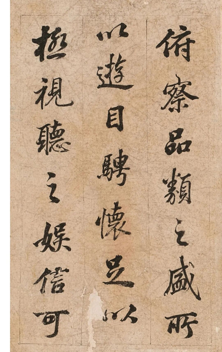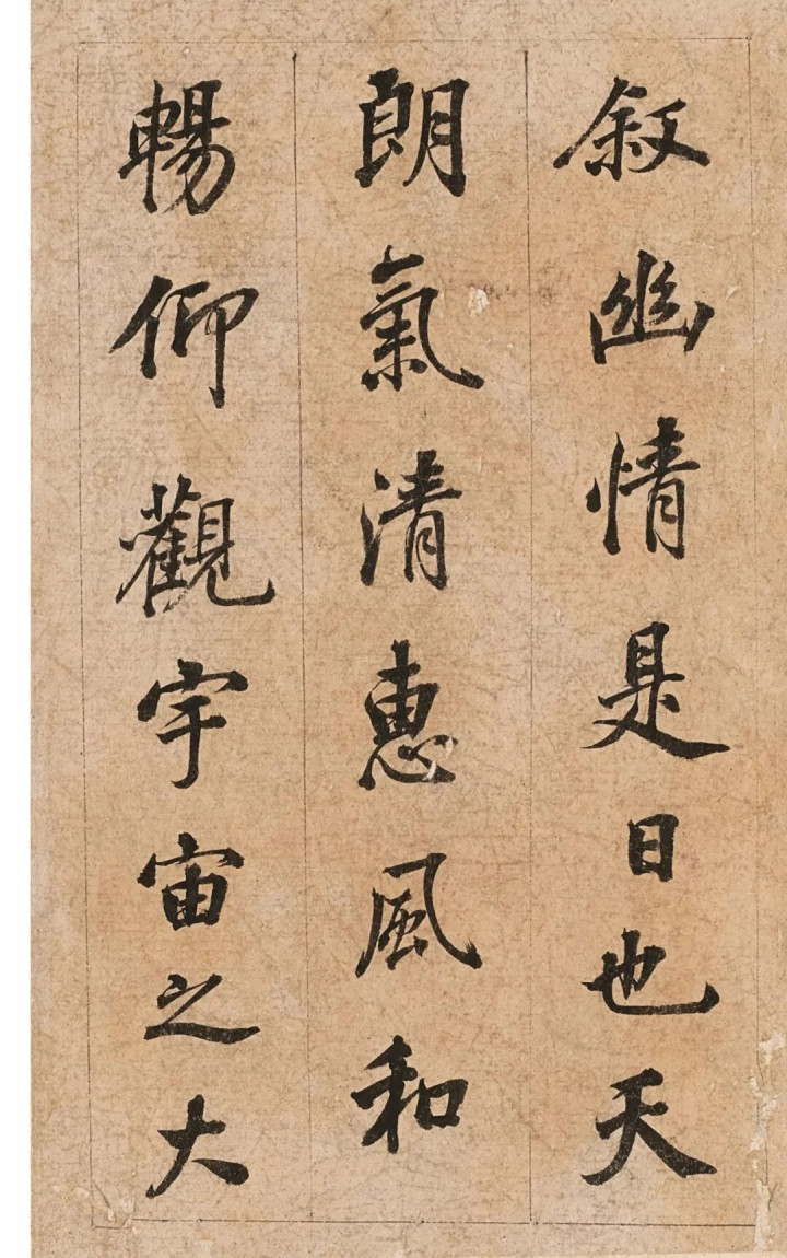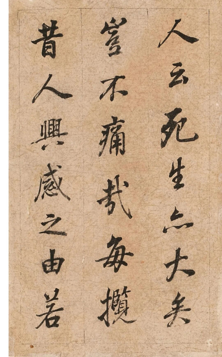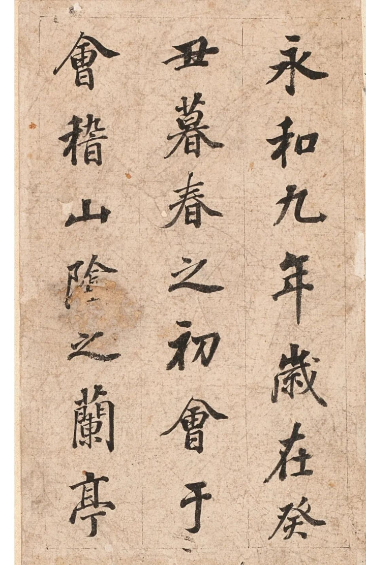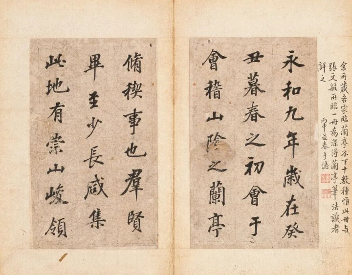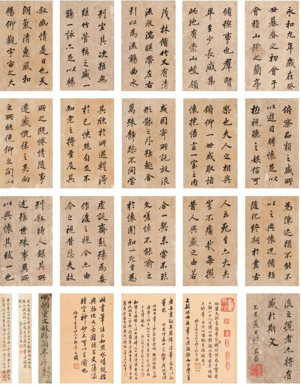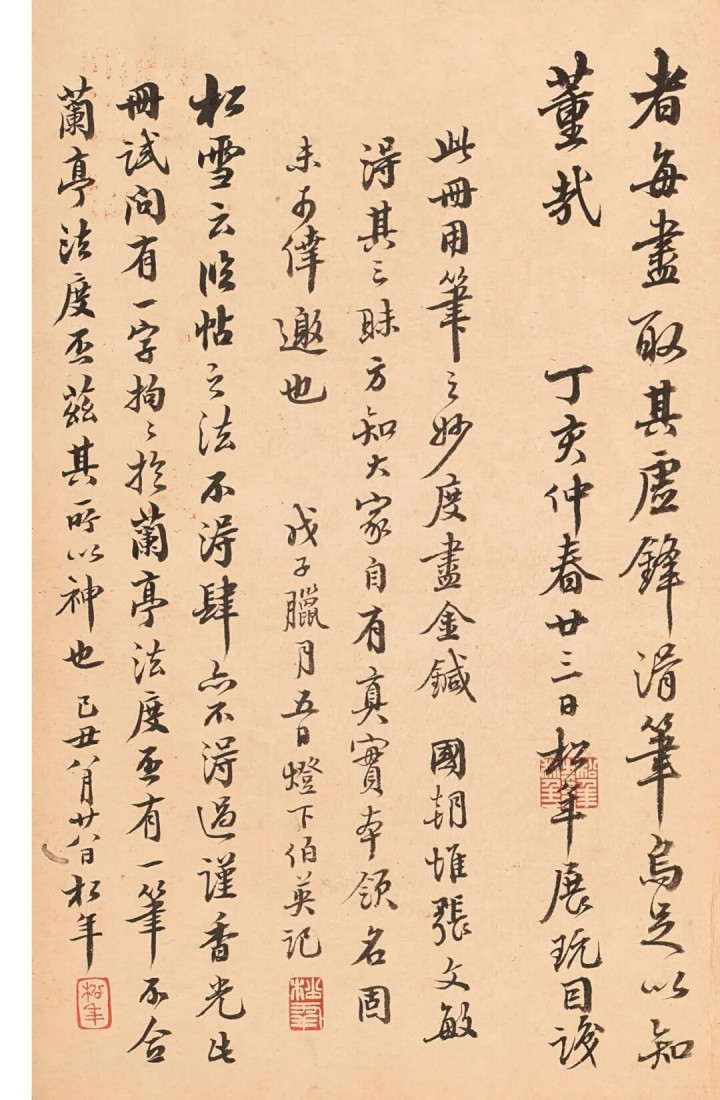 本幅董其昌临兰亭写于明神宗万历三十三年,时年五十一岁,时任翰林院侍讲官差湖广学政(万历三十二年始)。董其昌一生临过褚摹、唐摹、定武、颖上等诸本兰亭,对兰亭之美深有体悟。他曾谓:「兰亭非不正,其纵宕用笔处,无迹可寻,若形模相似,转去转远。」清末藏于古虞邵伯英松年家,自光绪九年(1883)得此后,至二十二年(1896)共跋七次,可见其宝爱。此外,并详载于二十九年(1903)的《澄兰室古缘萃录》石印本中。邵氏庋藏的兰亭,多达十数种,此件是邵氏认为最得兰亭笔法的作品之一(另件为张照书),并赞其无一笔不合兰亭之笔法,又无一字拘束于兰亭之规,实能得兰亭之神韵。