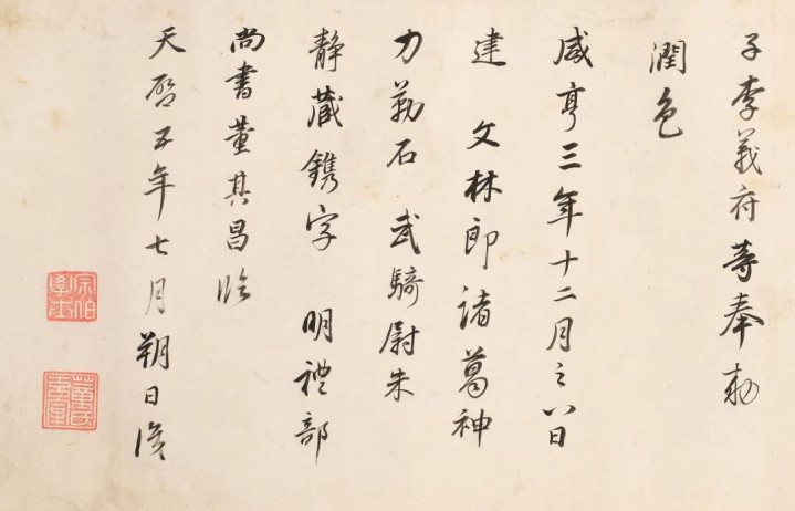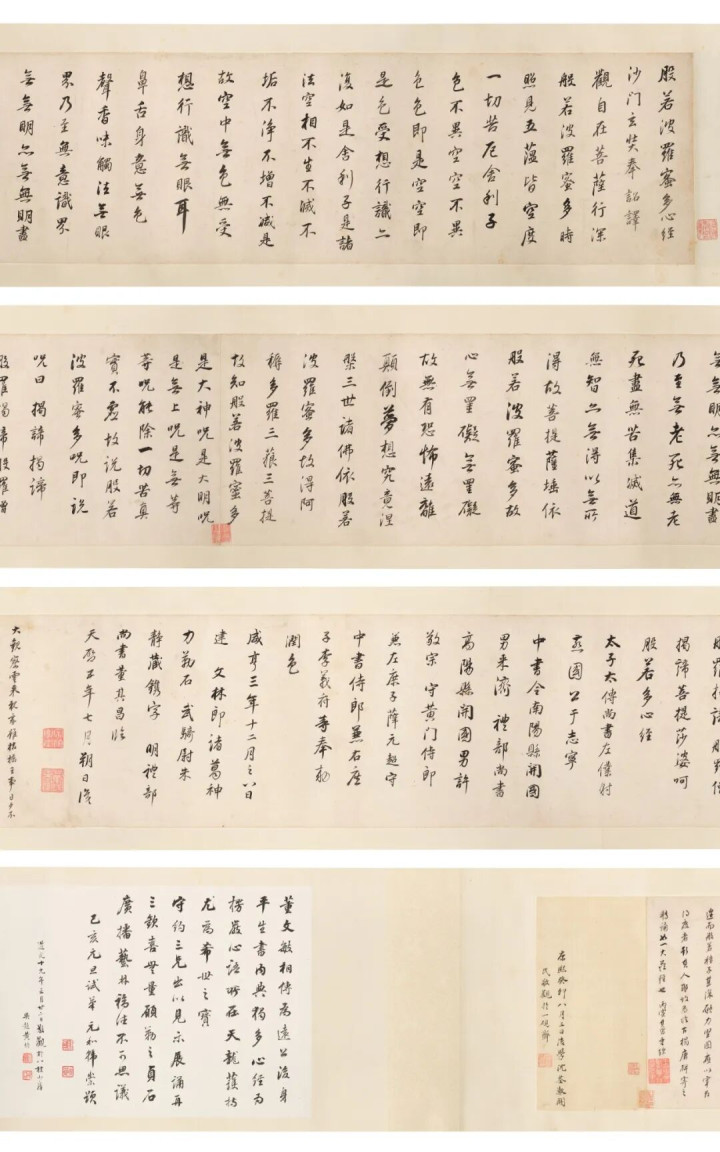 此卷落款为「明礼部尚书董其昌临,天启五年(1625)七月朔日识。」董其昌时年七十一岁,此年一月赴南京任礼部尚书。次年董其昌又补写题跋于后,阐明为「大观察云来亲家」临。据《董其昌系年》所载,天启五年和六年,董其昌抄写有多种《心经》,均为楷书册页。此卷后附沈荃、韩崇及黄均跋。据藏印可知清初曾为王鸿绪所藏,后归潘奕隽之「三松堂」。
