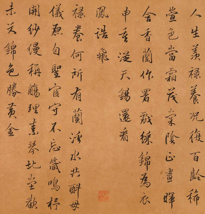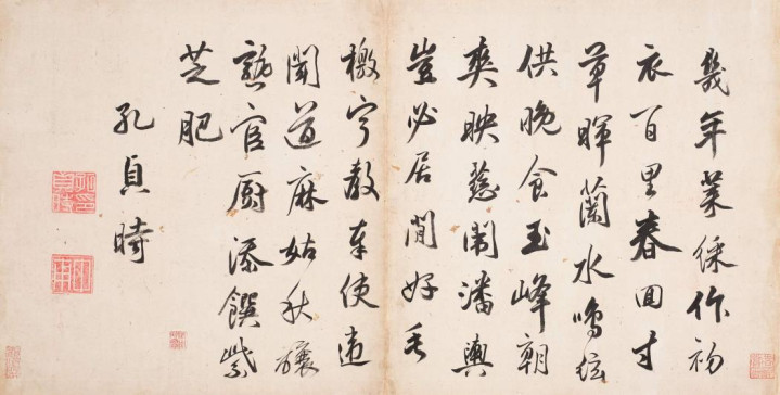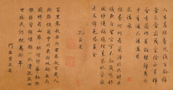 本幅为孔贞运弟孔贞时所书,内文与前幅其弟孔贞运相类,皆为孝母百龄诗。查孔氏一门福泽,其祖父孔弘玠德于邻里,高龄获授「寿官」,其祖母亦有鹤龄,父孔闻敕享耆八十余。孔贞时传世墨迹极稀,据晚明文学巨擘姚希梦《祭孔泰华泰史文》云:「文誉翱翔,才藻芳菲;国门之悬,纸贵南畿」,可知孔贞时之作于当时即一字千金,查公私所藏,此为仅见。