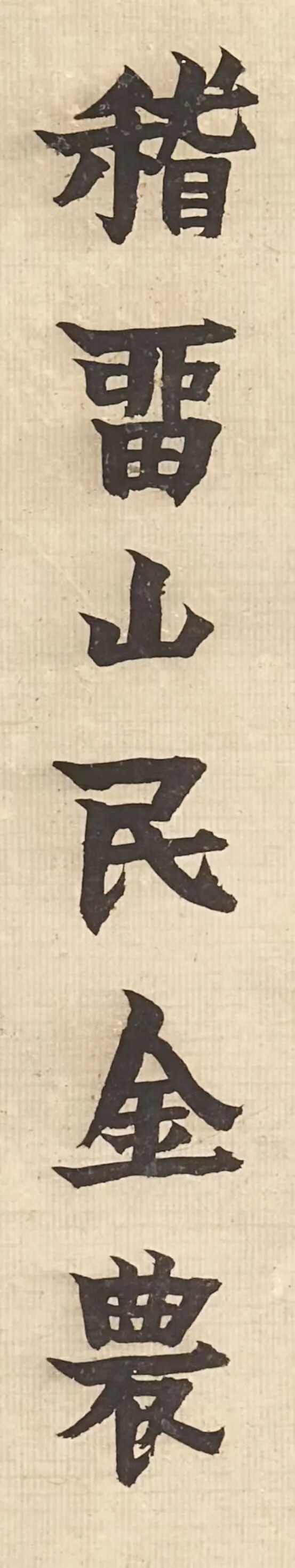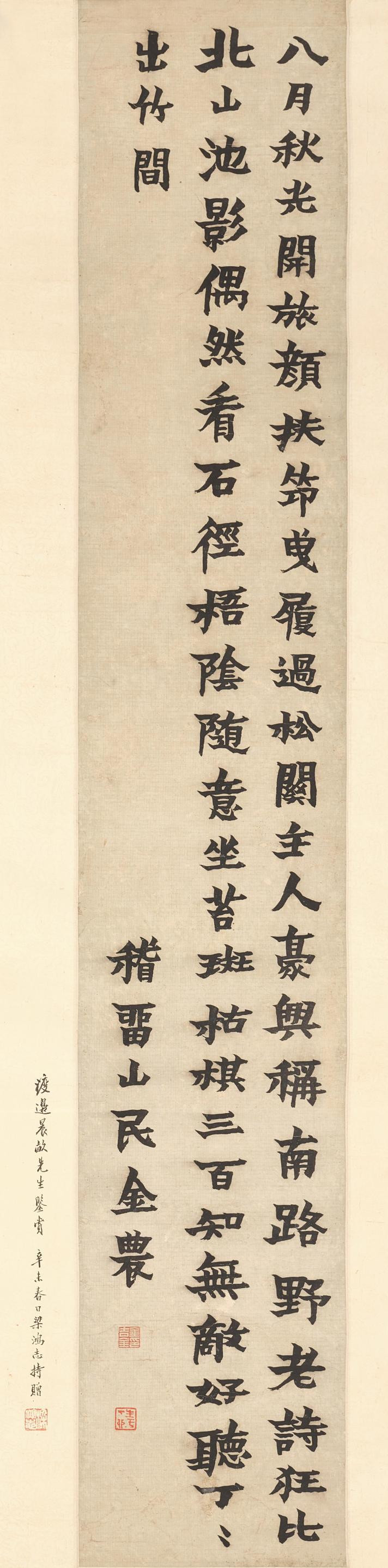 八月秋光开旅颜,扶笻曳履过松关。主人豪兴称南路,野老诗狂比北山。池影偶然看石径,梧阴随意坐苔斑。枯棋三百知无敌,好听丁丁出竹间。稽留山民金农。钤印:「金吉金印」、「生于丁卯」