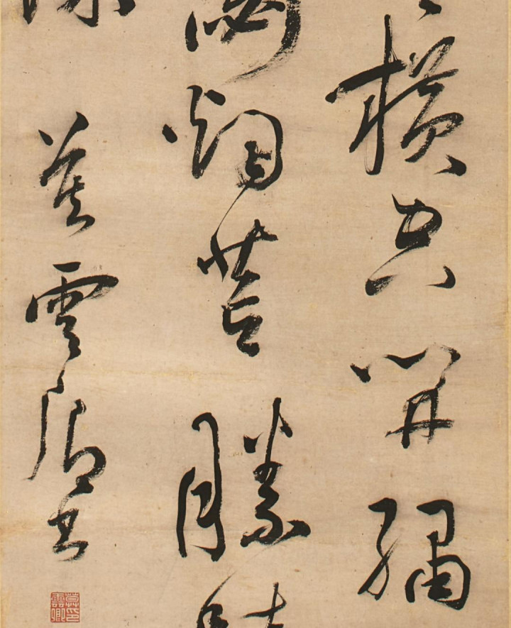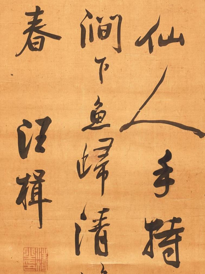 弹琴石壁上,翻翻一仙人。手持白鸾尾,夜扫南山云。鹿饮寒涧下,鱼归清海滨。当时汉武帝,书报桃花春。汪楫。钤印:「汪楫之印」、「悔斋」、「孤蓬自振惊沙坐飞」